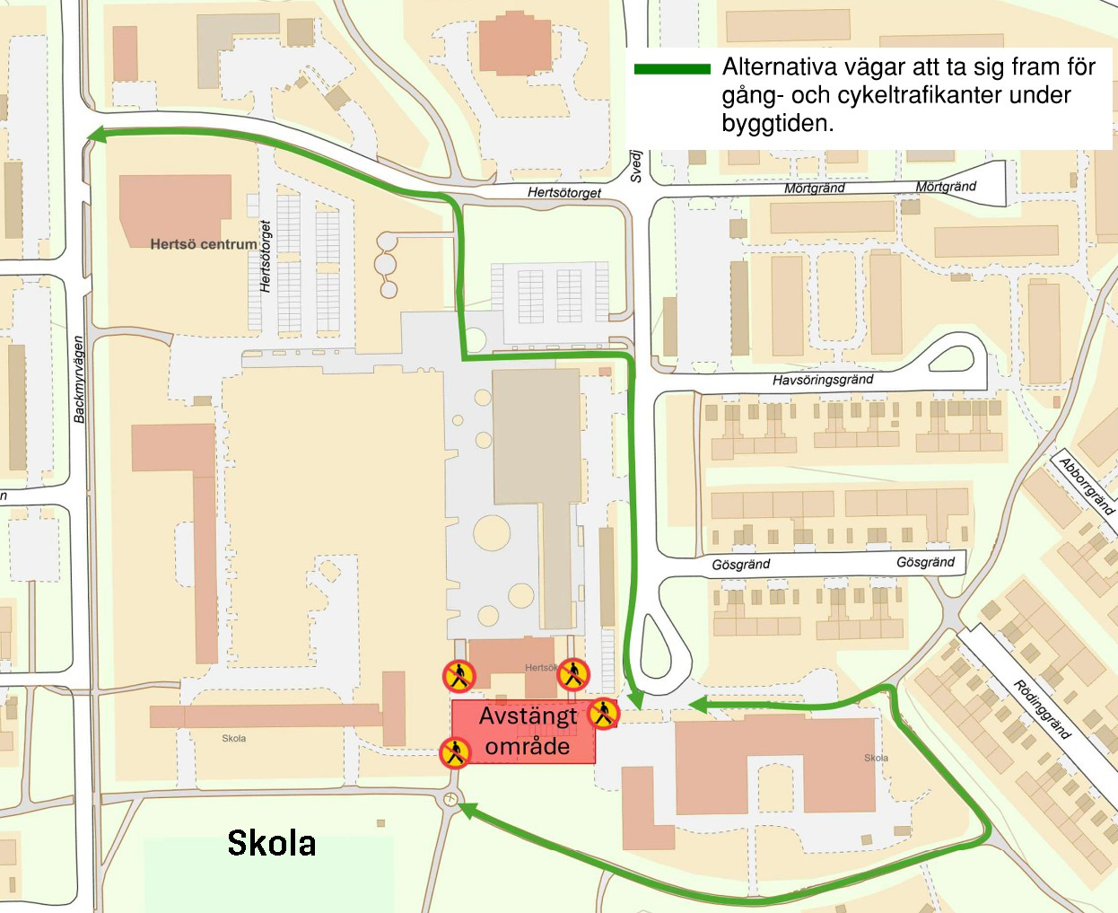 I och med avspärrningarna kommer det inte gå att ta sig fram via vissa gång- och cykelvägar under byggtiden. Kartskissen nedan visar alternativa vägar för gång- och cykeltrafikante.